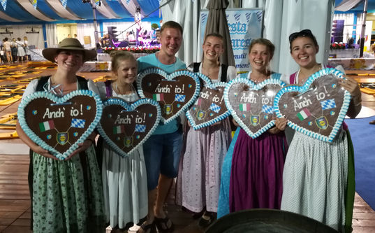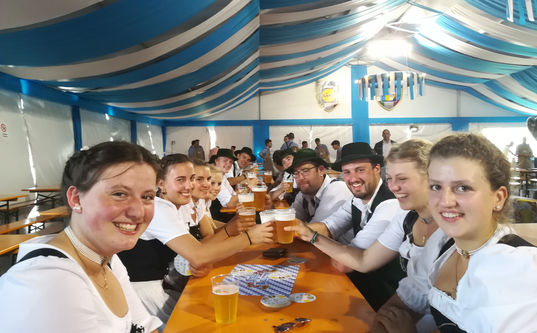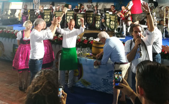 Am nächsten Morgen, nachdem die Burschen nach ein einer etwas kurzen Nacht, noch sehr zögerlich aus dem Bett kamen, machten es sich unsere Deandl bereits am Hotelpool bequem. Die Zeit am Donnerstagvormittag verging aber viel zu schnell, so dass es schon fast wieder etwas eilte um pünktlich und in vollständiger Festtracht zu einer kurzen Besprechung und der anschließenden Eröffnungsfeier anwesend zu sein. Mit dem Bus ging es zum Rathausplatz in die Altstadt von Peschiera wo die Gaugruppe zusammen mit dem Musikverein Eichenau und den Niklasreuthern Goaßlschnoizern ein erstes Mal Ihren gemeinsamen öffentlichen Auftritt hatten. Von der Altstadt ging es dann zur Lidl Filiale, wo nach einer kurzen Einlage der Blasmusik der Einzug ist Festzelt startete. Zu den Klängen eines schneidigen Marsches ging es zum vollbesetzten Zelt, wo bereits das Erste Fass Festbier zum Anzapfen bereit stand.